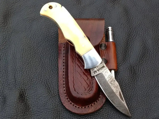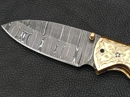 Damascus Steel Folding Knife-Damascus Steel Bolsters- Brass Hand Engraved Bolsters-SA102-R